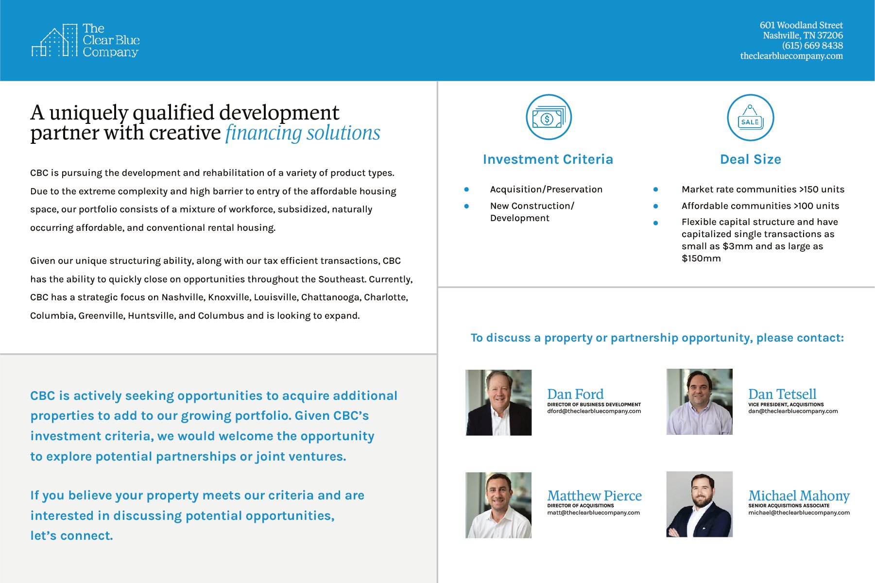 Clear Blue Company is a private equity firm dedicated to solving the affordable housing crisis by providing above-market returns for investors and creating upward mobility for residents. I’ve helped work on several projects after we helped them with their rebranding. I’ve created different prints, presentations, emails, etc. for them all revolving around their branding.